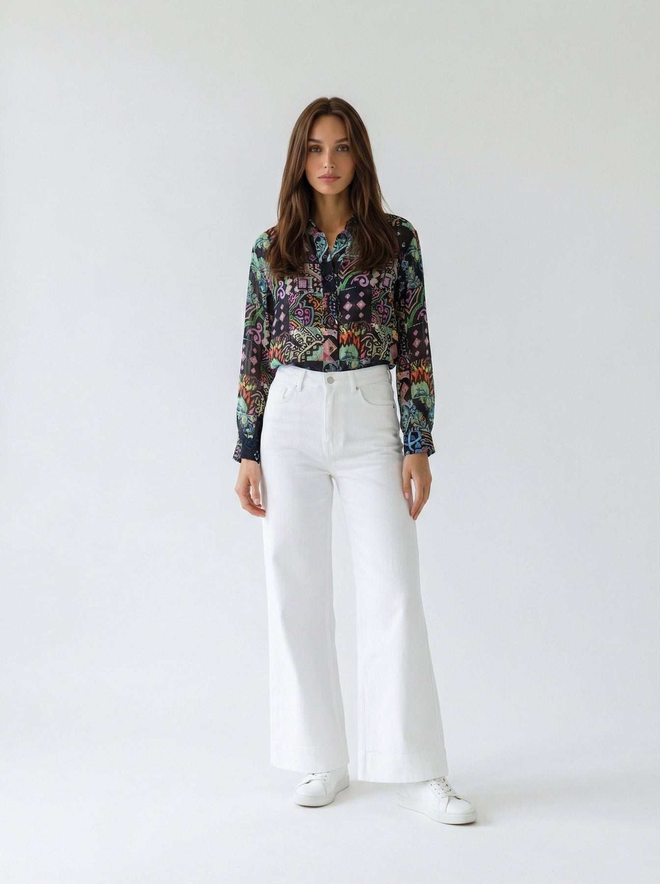 Our "JUNE" blouse is designed for a comfortable, slightly oversized, relaxed fit with drop shoulders, stand-up collar and elastic sleeve openings.