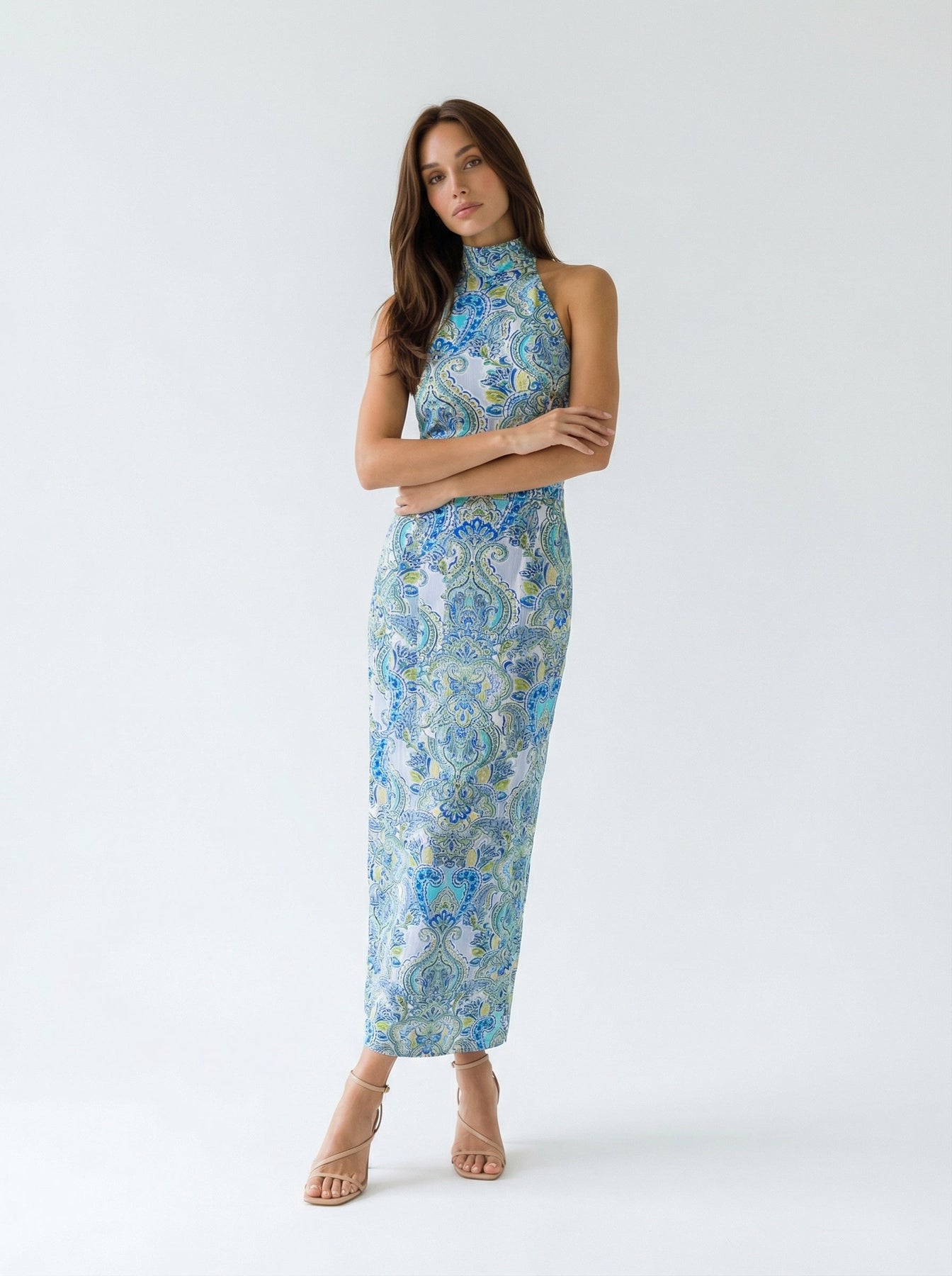 Our "NOLITA" features a timeless sleeveless halterneck design complemented by a detachable belt for cinching at the waist.